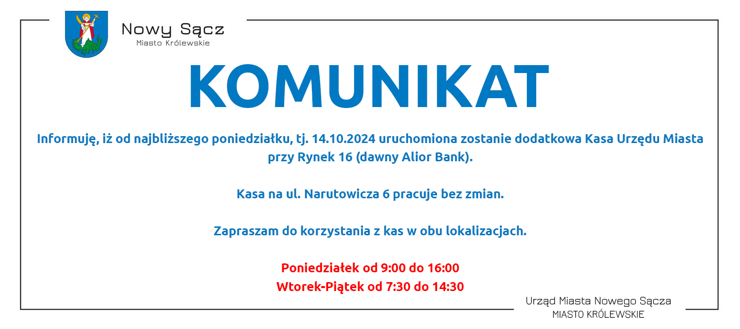 Urząd Miasta Nowego Sącza informuje, że od 14 października (poniedziałek) zostanie uruchomiona dodatkowa kasa urzędu. Będzie się ona mieścić przy ul. Rynek 16 (dawny Alior Bank).