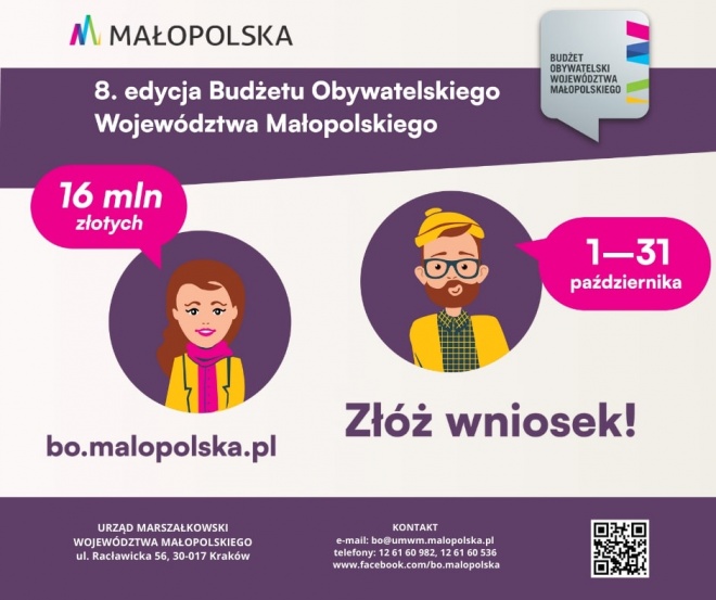 - Przed nami 8. edycja Budżetu Obywatelskiego. Już jesienią Małopolanie będą mogli zgłaszać swoje pomysły. Dzięki temu, wspólnie możemy zrealizować najciekawsze zaproponowane przez Państwa zadania, ważne dla lokalnych społeczności. W tym roku na ten cel przeznaczyliśmy aż 16 milionów złotych! Weź udział, bo warto - zachęca marszałek Łukasz Smółka.