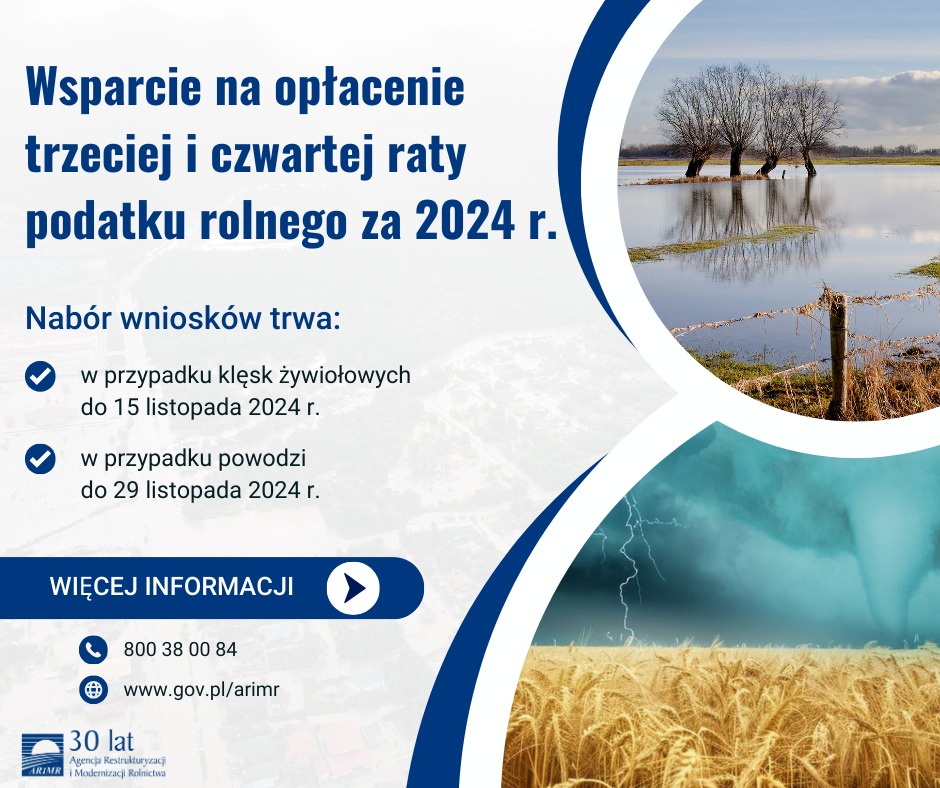 Także do połowy listopada można zgłaszać się po wsparcie na opłacenie III i IV raty podatku za 2024 r. dla poszkodowanych w 2024 r. w wyniku wystąpienia niekorzystnych zjawisk atmosferycznych – gradu, deszczu nawalnego, huraganu, przymrozków.