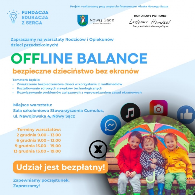 Fundacja „Edukacja z serca” wraz z Urzędem Miasta Nowego Sącza zapraszają rodziców i opiekunów dzieci przedszkolnych do udziału w bezpłatnych warsztatach dotyczących mądrego zarządzania czasem spędzanym przez dzieci przed ekranami.