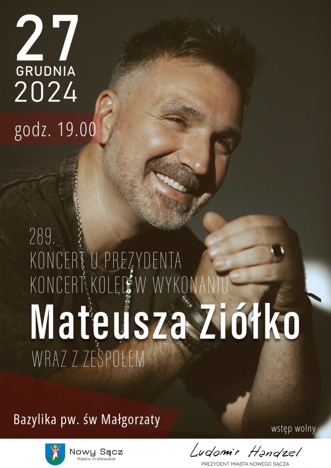 Prezydent Ludomir Handzel zaprasza na koncert kolęd w wykonaniu Mateusza Ziółko.