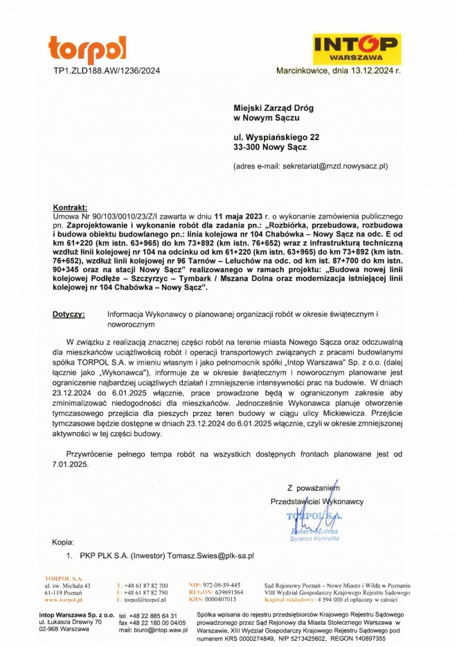 Ponadto w dniach od 23 grudnia do 6 stycznia prace przy budowie linii kolejowej będą prowadzone w ograniczonym zakresie. Po tym czasie, czyli od 7 stycznia, zostanie przywrócone normalne tempo prac oraz zlikwidowane tymczasowe przejście.