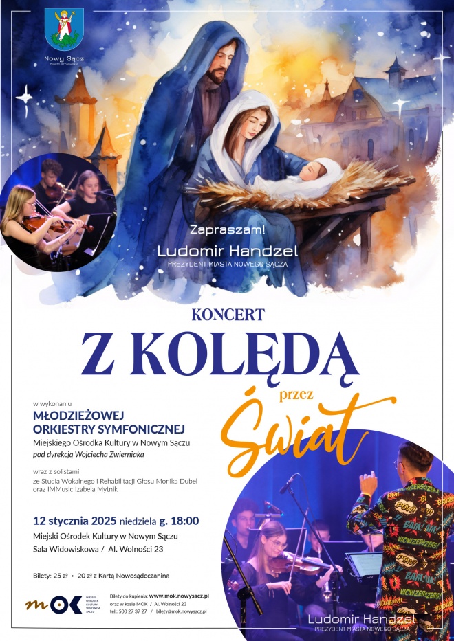 Miejski Ośrodek Kultury w Nowym Sączu zaprasza na koncert "Z kolędą przez świat" w wykonaniu Młodzieżowej Orkiestry Symfonicznej pod batutą Wojciecha Zwierniaka wraz z solistami ze Studia Wokalnego i Rehabilitacja Głosu - Monika Dubel oraz IMMusic Izabela Mytnik.