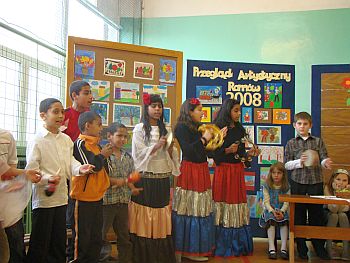 Uczniowie ze SP nr 9 przedstawili baśń pt "O ropusze i biednej wdowie" w wykonaniu zespołu „DZIECI WIATRU” prowadzonego przez panią Marzenę Królikiewicz oraz uczniów klasy III b pod kierunkiem wychowawczyni Barbary Majerskiej. Piękną scenografię do przedstawienia przygotowała pani Beata Piotrowicz. W uroczystości wzięli udział zaproszeni goście: pełnomocnik Prezydenta Miasta Nowego Sącza ds. Romów pan Krzysztof Popiela, starszy wizytator KO Delegatura w Limanowej pan Józef Wojas oraz przedstawiciel MOPS w Nowym Sączu pan Arkadiusz Stawiarz. Za piękne i kolorowe występy dzieci otrzymały nagrody pamiątkowe.