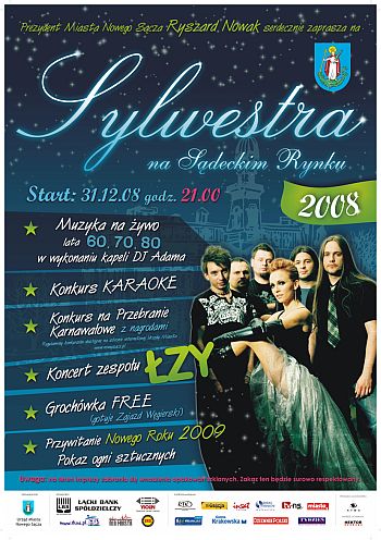 Koncert zespołu "Łzy", pokaz sztucznych ogni, świetna zabawa w rytmach muzyki z lat 60, 70, 80 w wykonaniu zespołu DJ Adama, konkursy i inne atrakcje towarzyszyć będą zabawie sylwestrowej na sądeckim Rynku. Tradycyjny Sylwester po chmurką, na który serdecznie zaprasza mieszkańców miasta i gości Prezydent Nowego Sącza Ryszard Nowak rozpocznie się 31 grudnia o 21.oo. W sylwestrowy nastrój wprowadzi nas DJ Adam wraz z zespołem, który około 21.30 poprowadzi pierwszy z konkursów przewidzianych na tę jedyna w roku noc. Będzie to konkurs Karaoke. Druga runda rozegrana zostanie około godz. 22.15. Organizatorzy zaplanowali również inny konkurs- na najładniejsze/najzabawniejsze przebranie karnawałowe. Prezentacja strojów nastąpi około 22.45. Uczestnicy walczyć będą o wspaniałe nagrody oraz tytuły: Przebierańca Roku, Karnawałowca Roku i Oryginał Roku. Około 23.15 rozpocznie się wspaniały koncert w wykonaniu zespołu „Łzy” - gwiazdy polskiej sceny muzycznej, zdobywcy dwóch platynowych płyt oraz dwóch Super Jedynek. Laureata nagrody publiczności na Festiwalu w Opolu w 2003 roku. Przeboje takie jak "Agnieszka", "Narcyz się nazywam", "Oczy szeroko zamknięte" i "Aniele Mój" zna zarówno młode jak i starsze pokolenie. Punktualnie o godzinie 24.00 wysłuchamy tradycyjnych życzeń noworocznych, wzniesiony zostanie toast i rozpocznie się pokaz sztucznych ogni. Na tym nie koniec, wszyscy nadal będziemy bawić się przy świetnej muzyce i tańcach w wykonaniu tancerek z Zespołu DJ Adama. Po raz pierwszy uczestnicy zabawy sylwestrowej częstowani będą gorącym daniem. Przygotowano 2000 porcji gorącej grochówki z kiełbasą i chlebem. Będzie można również kupić grillowane przysmaki i napić się gorących napojów. Nad bezpiecznym przebiegiem imprezy będzie czuwać kilkudziesięciu ochroniarzy, straż miejska i oczywiście służby medyczne oraz policja. Wzorem ubiegłego roku na rogatkach rynku będzie się odbywać kontrola, wszystkich osób udających się pod Ratusz.