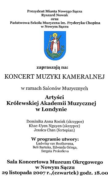 w Sali Koncertowej Muzeum Okręgowego, ul. Lwowska (Dom Gotycki) w Nowym Sączu, w dniu 29 listopada 2007 r., (czwartek) o godzinie 18.00. Wystąpią: Dominika Anna Rosiek – Skrzypce, Khac-Uyen Nguyen –Skrzypce, Jessica Chan – Fortepian.