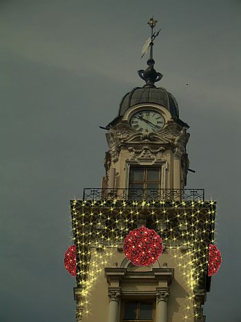 Nowy, świąteczny wygląd zyska również wieża ratuszowa. Pod balkonem znajdującym się ponad zegarem zawisną czerwone ozdoby, obok nich umieszczona zostanie świetlna kurtyna.