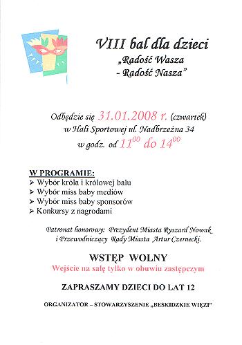 Ciekawą propozycją dla dzieci, w czasie ferii jest bal „Radość Wasza – Radość Nasza”, który w tym roku zostanie zorganizowany po raz ósmy. Dzieci bawić się będą w strojach karnawałowych, w hali sportowej przy ulicy Nadbrzeżnej w ostatni dzień stycznia, w godzinach od 11.00 do 14.00. W trakcie balu odbędzie się konkurs na króla i królową balu, zostaną wyłonieni zwycięzcy wyborów miss balu, a także dzieci wezmą udział w innych atrakcyjnych zabawach. Uczestnicy balu mogą wejść na salę tylko w obuwiu zastępczym. Organizatorem balu jest stowarzyszenie „Beskidzkie Więzi”, z radną Barbarą Jurowicz na czele. Patronat honorowy nad imprezą sprawują: Prezydent Miasta Nowego Sącza – Ryszard Nowak i Przewodniczący Rady Miasta – Artur Czernecki.