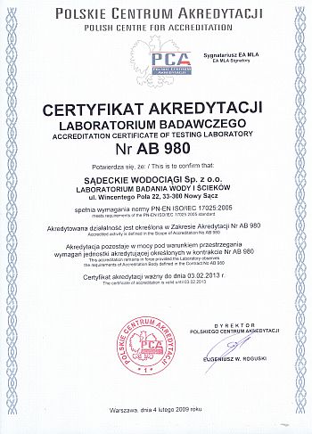 Sądeckie Wodociągi Spółka z o.o. pomyślnie zakończyła prace nad wdrożeniem systemu zarządzania jakością według normy PN-EN ISO/IEC 17025:2005 w swoim laboratorium badania jakości wody.