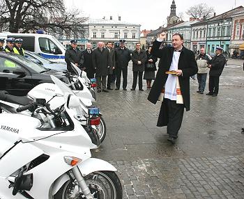 Poświęcenia nowych pojazdów dokonał ksiądz prałat Andrzej Jeż. Tuż przed uroczystością przekazania nowych radiowozów odbyła się narada w siedzibie Miejskiej Komendy Policji w Nowym Sączu. Komendant Miejski – Witold Bodziony przedstawił osiągnięcia nowosądeckiej policji w roku 2007. Podczas narady, która odbywała się w obecności Komendanta Mariusza Dąbka, Prezydenta Ryszarda Nowaka, Komendanta Straży Miejskiej - Ryszarda Wasiluka, a także Starosty Nowosądeckiego Jana Golonki dziękowano prezydentowi za przekazanie w roku 2007 środków finansowych w ramach funduszu wsparcia z samorządu Miasta Nowego Sącza. Za 265 tysięcy złotych zostały zakupione nowe pojazdy – 130 tysięcy złotych, oraz doposażono sądecką policję.