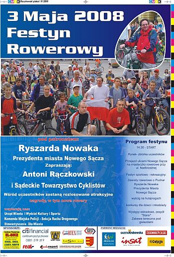 W sobotę, 3 maja – spod nowosądeckiego ratusza wyruszy tradycyjny peleton rowerzystów. Podobnie jak przed rokiem radny Antonii Rączkowski i Prezydent Nowego Sącza Ryszard Nowak zapraszają wszystkich mieszkańców do udziału w „Festynie Rowerowym”. Początek o godz. 14.30 na sądeckim Rynku. Zakończenie oraz wiele konkursów, gier i zabaw zaplanowano na Miasteczku Rowerowym.