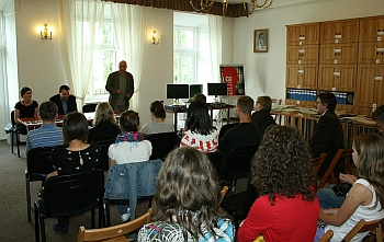 Po zakończeniu pierwszej części warsztatów i poczęstunku, młodzież spotkała się z dyrektorem krakowskiego oddziału Instytutu Pamięci Narodowej Markiem Lasotą, który opowiedział o początkach działalności IPN i o pracy bieżącej. Sądeczanie usłyszeli o strukturze instytutu, a także ciekawostki dotyczące najbardziej niezwykłych odkryć, na które natrafili badacze dokumentów.