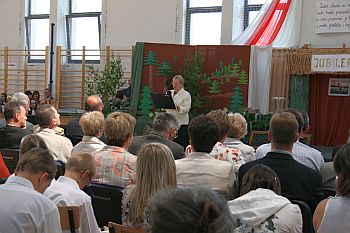 Dyrektor szkoły Halina Węgrzyn przypomniała historię najmłodszej sądeckiej placówki. „16 czerwca to ważna data w dziesięcioletniej historii szkoły. 1998r., Rada Miasta Nowego Sącza nadaje szkole statut i imię Jana Pawła II, 1999r. sam patron – 16 czerwca na Błoniach Starosądeckich – poświęca nasz sztandar”- mówiła dyrektor szkoły. „Idąc za słowami Jana Pawła II” wymagajcie od siebie nawet wtedy kiedy inni od was wymagać nie będą” pomagamy uczniom „przekraczać próg nadziei” i „ wejść w jego głąb”.