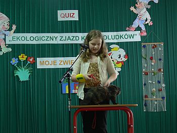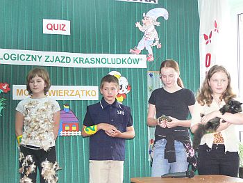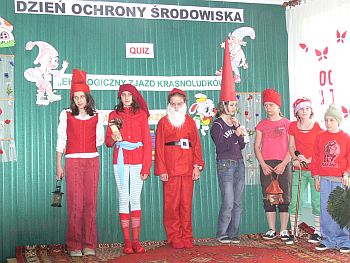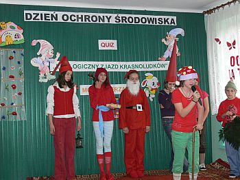 Kulminacją programu był konkurs wiedzy w formie quizu." Mistrzem ekologii" została uczennica klasy VI Agnieszka Karwala, tuż za nią Gabriela Bochniarz i Justyna Ziółkowska- uczennice kl.V. Radosne uśmiechy, wdzięczne serca, gromkie brawa i podziękowania od dzieci otrzymali przybyli goście: Pani Elżbieta Chowaniec- radna miasta Nowego Sącza oraz Pan Traciłowski, który reprezentował Wydział Gospodarki Komunalnej i Ochrony Środowiska UM Nowego Sącza. Nagrodzili zwycięzców konkursowych przyniesionymi książkami oraz krzewami ozdobnymi. Tradycyjnie kilka krzewów do ogrodu otrzymała szkoła, które zostały przekazane dyrektorowi szkoły-Pani mgr Halinie Stanek.