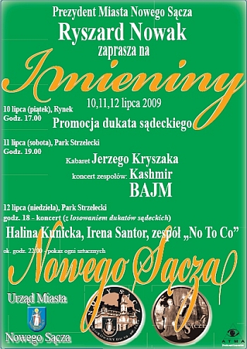 Koncert zespołu „Bajm”, Kashmir, Ireny Santor, Haliny Kunickiej, zespołu „No to co” oraz kabaret Jerzego Kryszaka – to atrakcje, jakie dla mieszkańców przygotowano z okazji zbliżających się „Imienin miasta”. W tym roku, po raz drugi, wszyscy bawić się będziemy w Amfiteatrze przy ul. Ogrodowej. „Program imienin jest bardzo ciekawy. Przygotowany tak, aby mogli bawić się wszyscy. Będzie kabaret oraz doskonała zabawa z jednym z najlepszych zespół w Polsce. Zaprosiliśmy zespół Bajm oraz wokalistów, zaśpiewa między innymi Irena Santor. Ponadto loteria, w której będzie można wylosować lokalne dukaty. Warto wybrać się również w piątek na spotkanie z Michałem Sędziwojem na sądeckim Rynku. Mam nadzieję, że podobne jak i w ubiegłym roku, każdy znajdzie chwilę czasu, aby przyjść do parku, posłuchać dobrej muzyki, spotkać się z przyjaciółmi i świętować razem imieniny Nowego Sącza”- mówi prezydent Ryszard Nowak.