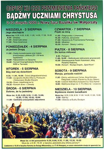Rozpoczął się Odpust ku czci Przemienia Pańskiego. W niedzielę, o godzinie 11.00 sprawowano eucharystię na początek tygodniowych rozważań pod hasłem: „Bądźmy Uczniami Chrystusa”. Mszy świętej inaugurującej odpust przewodniczył ksiądz biskup Marian Buczek z Ukrainy. Poniedziałkowy dzień zadedykowano osobom konsekrowanym, wtorek – dzieciom. W środę odbędą się centralne uroczystości, o godzinie 11.00 rozpocznie się eucharystia pod przewodnictwem księdza biskupa ordynariusza – Wiktora Skworca. W czwartek do sądeckiego sanktuarium będą przybywać pielgrzymi i młodzież. Piątek jest dniem przewidzianym dla policjantów i małżonków. W sobotę przed cudownym obrazem modlić się będą chorzy, wolontariusze Caritas, Akcja Katolicka, pracownicy Służby Zdrowia, czciciele Matki Bożej Szkaplerznej i Świętego Ojca Pio.