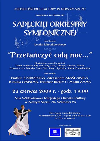 W najbliższy wtorek, 23 czerwca, o godz. 19.00 w MOK odbędzie się kolejny koncert Sądeckiej Orkiestry Symfonicznej bod batutą Leszka Mieczkowskiego. Podczas koncertu zat. „Przetańczyć całą noc” najpiękniejsze piosenki z musicali: „Upiór w operze”, „My Fair Lady”, „Cats”, „Chicago”, „Cabaret”, „Metro”, „Człowiek z La Manchy”, „Nędznicy” zaśpiewają: Natalia Zabrzeska, Aleksandra Maślanka, Klaudia Leśniak, Mateusz Bierut i Adam Żaak.