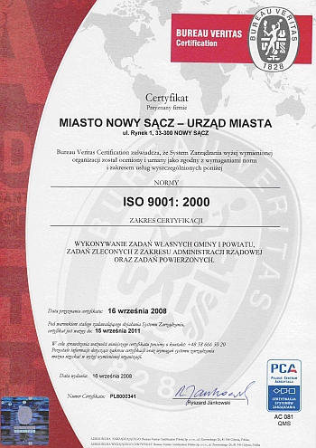 W Urzędzie Miasta Nowego Sącza przeprowadzony został zewnętrzny audyt kontrolny systemu zarządzania ISO 9001:2000 poprzedzony spotkaniem audytorów Bureau Veritas International z Prezydentem Miasta Ryszardem Nowakiem i Pełnomocnikiem Prezydenta Miasta ds. Systemów Zarządzania Jakością Wojciechem Piechem. Audytowi poddanych zostało 10 komórek organizacyjnych Urzędu Miasta. Na podstawie informacji uzyskanych podczas spotkania zamykającego audyt można poinformować, że audytorzy nie stwierdzili żadnej niezgodności w audytowanych komórkach organizacyjnych. Co najważniejsze system zarządzania w Urzędzie Miasta Nowego Sącza, jak i jego generalne funkcjonowanie zostało ocenione bardzo dobrze, a tym samym Urząd Miasta Nowego Sącza utrzymał Certyfikat ISO 9001:2000 przyznany w ubiegłym roku na lata 2008 - 2011. W związku z wejściem w życie normy PN-EN ISO 9001:2009 w kwietniu br. przyszłoroczny audyt kontrolny zostanie przeprowadzony już wg wymagań zmienionej normy.