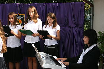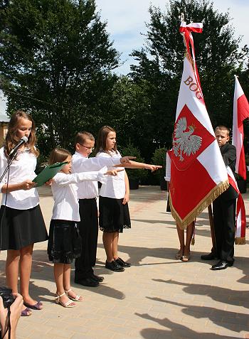 Następnie na dziecińcu szkolnym odbyła się uroczysta akademia z udziałem lokalnych władz samorządowych, duchowieństwa, mieszkańców gminy, uczniów i rodziców. Uczniowie odśpiewali hymn szkolny i zaprezentowali krótki program artystyczny. Dyrektor szkoły – Urszula Łabuda przypomniała przybyłym na uroczystość gościom historię szkoły i zaprezentowała nowy sztandar. Po przemówieniu dyrektora, uczniowie ze szkoły w Rdziostowie złożyli przed nowym sztandarem akt ślubowania.