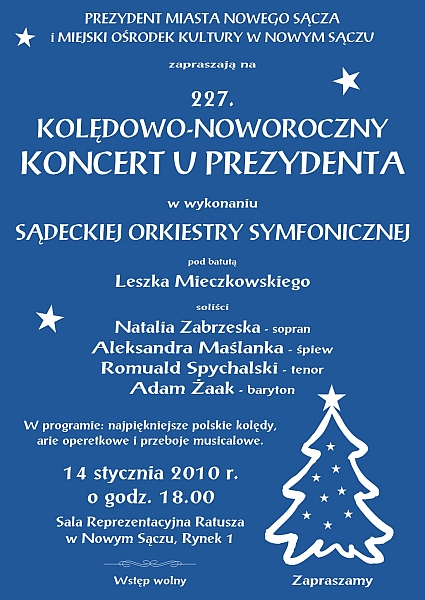 W najbliższy czwartek 14 stycznia 2010 r., w sali reprezentacyjnej sądeckiego ratusza, odbędzie się 227. Koncert u Prezydenta Miasta Nowego Sącza.