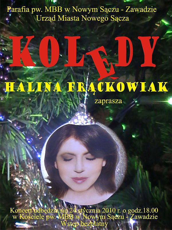 Najpiękniejsze kolędy i pastorałki w wykonaniu znanej polskiej piosenkarki Haliny Frąckowiak, będzie można posłuchać już w najbliższą niedzielę. 24 stycznia 2009 r., o godz. 18.00 w Kościele pw. MBB w Nowym Sączu - Zawadzie odbędzie się koncert w wykonaniu tej znanej wokalistki. Organizatorem koncertu jest Parafia pw. MBB oraz Urząd Miasta