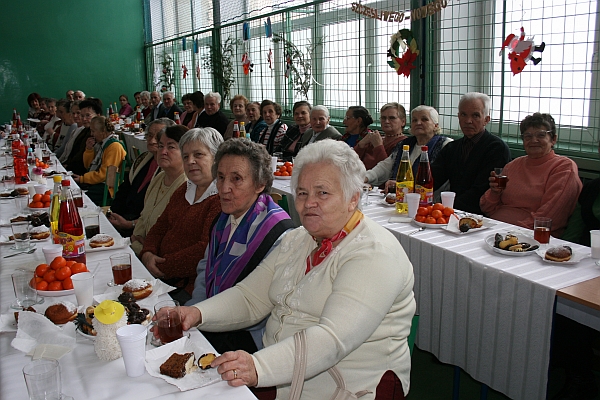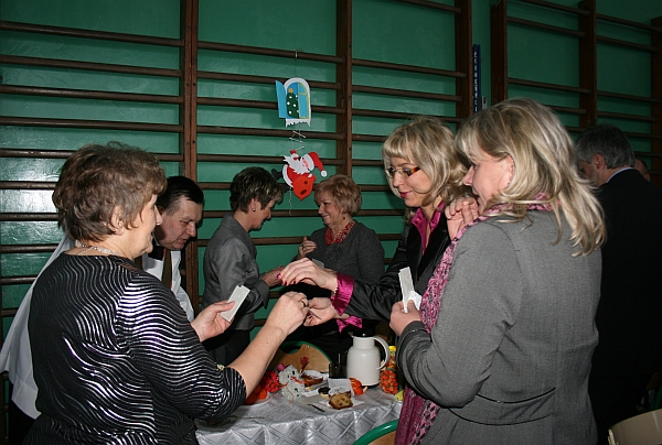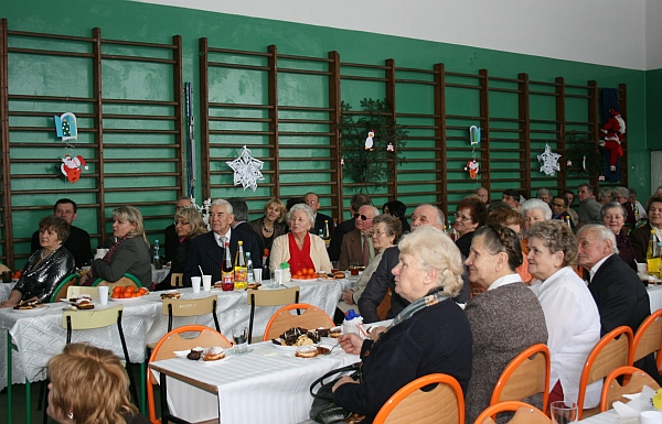Następnie wiceprezydent Bożena Jawor złożyła seniorom najlepsze życzenia, zdrowia, dużo dobra, serdeczności i uśmiechu wokół oraz wszelkiej pomyślności w nowym roku. Do życzeń dołączyła się przewodnicząca Teresa Cabała oraz ks. prałat Józef Janas, który poświęcił opłatki. Po modlitwie, przy dźwiękach kolęd w wykonaniu zespołu instrumentalno – wokalnego z parafii św. Rocha w Dąbrówce, seniorzy przełamali się opłatkiem życząc sobie wszystkiego dobrego.