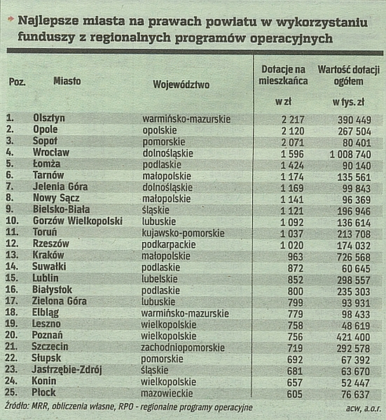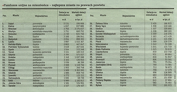 W rankingu gmin najlepiej sięgających po unijne fundusze Rzeczpospolita brała pod uwagę wartość podpisanych umów według miejsca realizacji projektu . Analizowano fundusze strukturalne, (zarządzane przez Ministerstwo Rozwoju Regionalnego), nie uwzględniono funduszy rolnych (Program Operacyjny Ryby oraz Program Rozwoju Obszarów Wiejskich zarządzane przez Ministerstwo Rolnictwa).