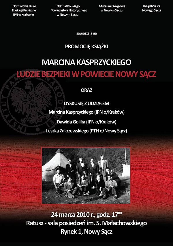 Promocja książki Marcina Kasprzyckiego ”Ludzie bezpieki w powiecie nowosądeckim” odbędzie się 24 marca w sali reprezentacyjnej sądeckiego ratusza. W trakcie spotkania zaplanowano dyskusję z udziałem Marcina Kasprzyckiego, Dawida Golika i Leszka Zakrzewskiego.
