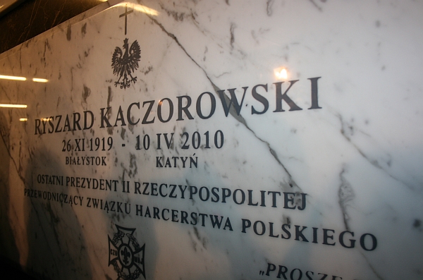 Ryszard Kaczorowski spoczął tuż obok byłego ministra spraw zagranicznych Krzysztofa Skubiszewskiego. W świątyni pochowani są także: ksiądz Jan Twardowski oraz kapelan Rodzin Katyńskich ks. prałat Zdzisław Peszkowski. Na tablicy marmurowej widnieje napis – słowa, które w 1991 roku w Białymstoku, rodzinnym mieście Ryszarda Kaczorowskiego, wypowiedział Jan Paweł II: "Proszę przekazać rządowi w Londynie podziękowania za przechowanie suwerenności Rzeczypospolitej".