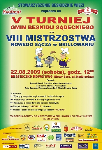 Stowarzyszenie Beskidzkie Więzi zaprasza na V Turniej Gmin Beskidu Sądeckiego oraz VIII Mistrzostwa Nowego Sącza w Grillowaniu, które odbędą się w sobotę 22 sierpnia, na terenie Miasteczka Rowerowego, przy ulicy Nadbrzeżnej w Nowym Sączu. Impreza rozpocznie się o godz. 12:00. Zawodnicy, którzy przystąpią do turnieju będą zmagać się o Puchar Prezydenta Miasta oraz nagrody pieniężne. W konkursie grillowania udział wezmą przedstawiciele Nowego Sącza, Starego Sącza, Rytra, Korzennej i Ptaszkowej.