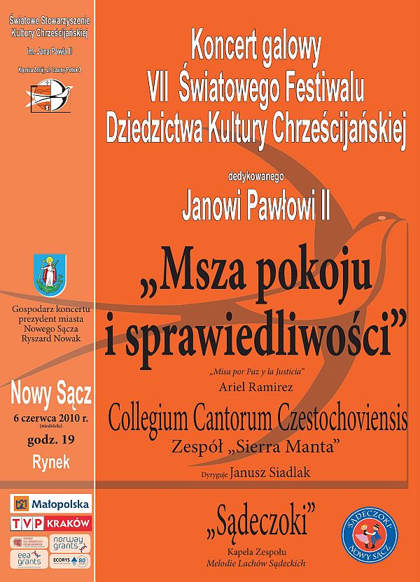 Koncert galowy, podczas którego Collegium Cantorum Czestochoviensis i Zespół "Sierra Manta" pod dyrekcją Janusza Siadlaka wykona "Mszę pokoju i sprawiedliwości" ("Misa por Paz y la Justicia") argentyńskiego kompozytora Ariela Ramireza, zainauguruje Światowy Festiwal Kultury Chrześcijańskiej. Organizatorem festiwalu jest Światowe Stowarzyszenie Kultury Chrześcijańskiej im. Jana Pawła II z siedzibą w Krynicy.