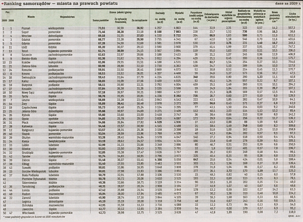 Dla porównania, np. Kraków (10 m.) uzyskał łącznie 61,06 pkt., w tym 29,55 pkt. za sytuacje finansową i 31,51 pkt. za zarządzanie, a Tarnów (35m.) – łącznie 51,74 pkt., w tym 34,83 pkt. za sytuację finansową i 16,91 pkt. za zarządzanie.