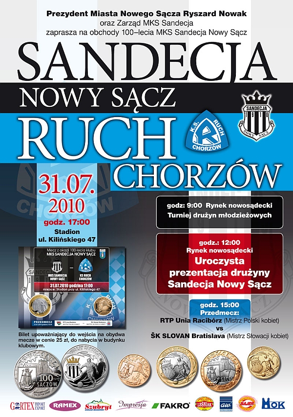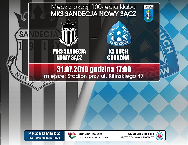 Oficjalna prezentacja zawodników MKS Sandecja przed sezonem 2010/2011, mini turniej piłkarski, mecz Sandecji Nowy Sącz z Ruchem Chorzów – to tylko niektóre atrakcje przygotowane z okazji jubileuszu 100-lecia sądeckiego klubu, na które już w najbliższą sobotę zaprasza Prezydent Miasta Nowego Sącza Ryszard Nowak oraz Zarząd MKS Sandecja. Wiemy już, że zespół Ruchu Chorzów przyjedzie do Nowego Sącza w najsilniejszym składzie.