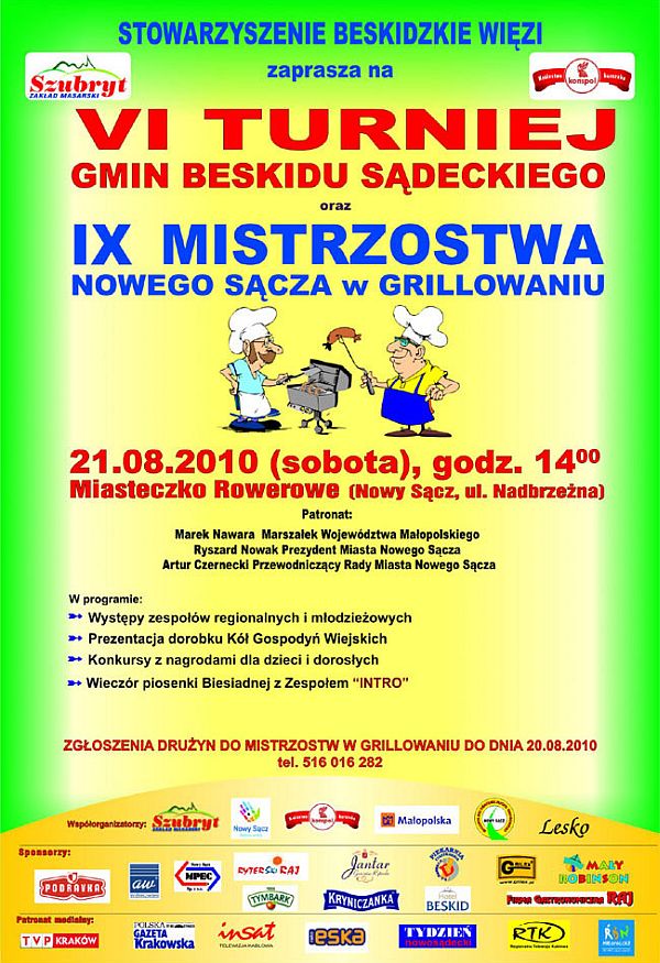 Stowarzyszenie Beskidzkie Więzi zaprasza 21 sierpnia 2010 r. (sobota) do Miasteczka Rowerowego przy ul. Nadbrzeżnej na VI Turniej Beskidu Sądeckiego - IX Mistrzostwa Nowego Sącza w Grillowaniu.