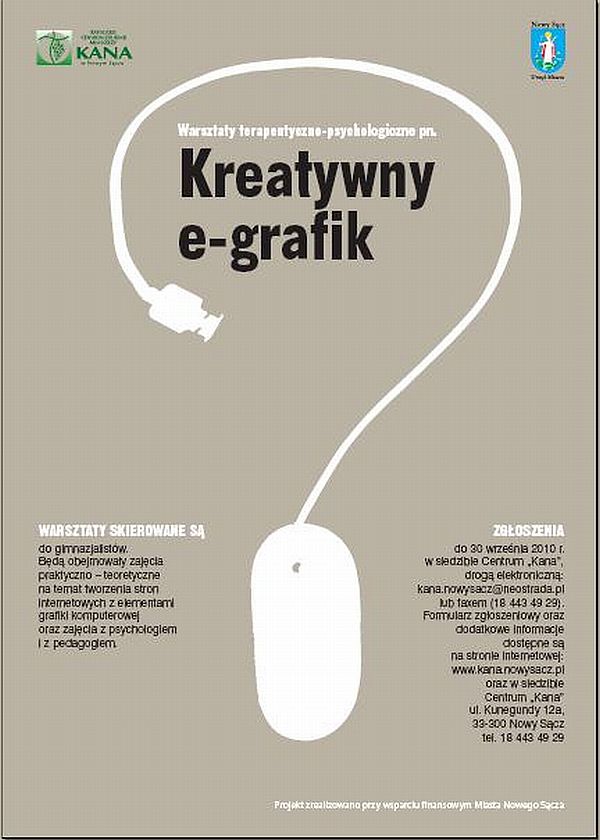 Katolickie Centrum Edukacji Młodzieży „Kana” informuje, iż dzięki wsparciu finansowemu Miasta Nowego Sącza, rozpoczyna rekrutację uczniów nowosądeckich gimnazjów do udziału w Warsztatach terapeutyczno – psychologicznych połączonych z nauką grafiki komputerowej pn. „Kreatywny e-grafik”.