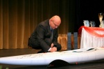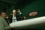 Zaproszeni goście składali pamiątkowe podpisy na kajaku, którym na salę „wpłynął” kajakarski mistrz Dariusz Popiela – syn jednego z braci.