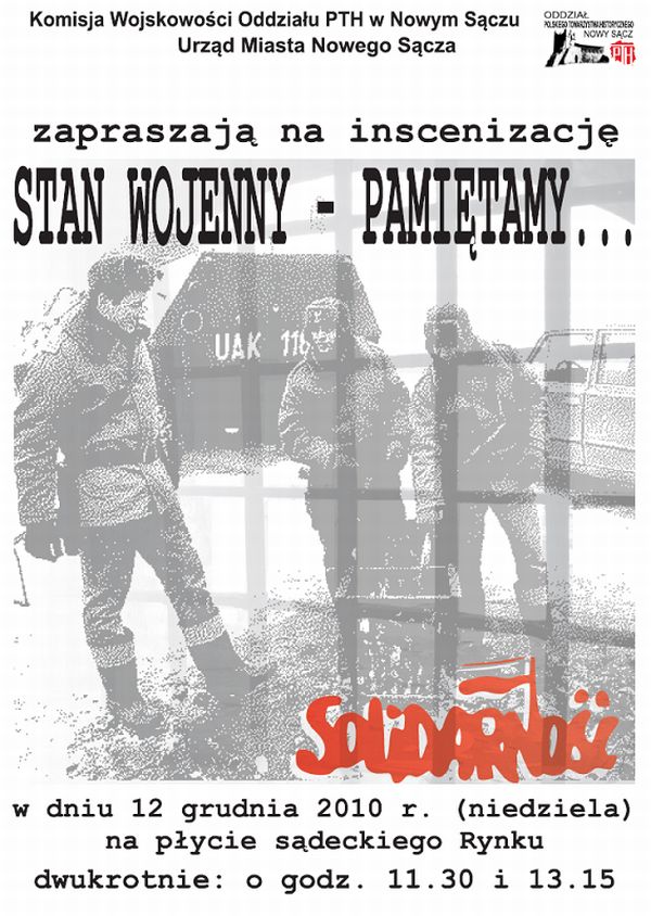 12 grudnia 2010 r. o godz. 11.30 i 13.15 na płycie nowosądeckiego Rynku będzie można obejrzeć inscenizację „Stan wojenny - pamiętamy…”. Spektakl poprzedzi krótki opis wydarzeń związanych z wprowadzeniem stanu wojennego, który przedstawi prezes PTH Leszek Zakrzewski.