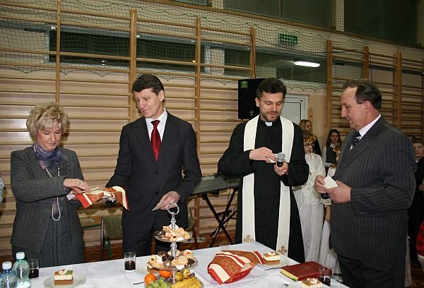 Potem przyszedł czas na przełamanie się opłatkiem, który poświęcił ks. Mikołaj Piec, składając mieszkańcom najlepsze życzenia, do których dołączyli się również: przewodniczący osiedla oraz goście spotkania.