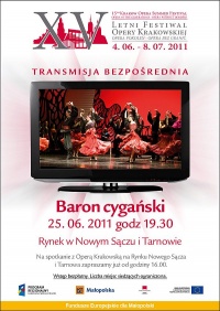 W sobotę 25 czerwca wielka atrakcja kulturalna dla sądeczan! Na Rynku przez ratuszem o godz. 19.30 rozpocznie się bezpośrednia transmisja ze spektaklu „Baron cygański” (Johanna Straussa, w inscenizacji Laco Adamika) z Opery Krakowskiej. Widowisko można będzie obejrzeć w ramach projektu "OPERA POKOLEŃ - OPERA BEZ GRANIC" - XV Letni Festiwal Opery Krakowskiej.