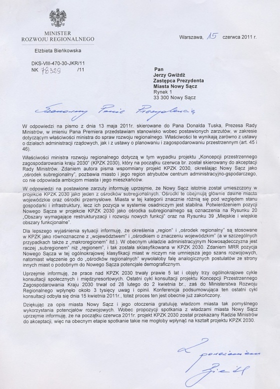 Minister Rozwoju Regionalnego Elżbieta Bieńkowska odpowiedziała na pismo, jakie 13 maja 2011 roku sądeccy samorządowcy skierowali do Donalda Tuska, Prezesa Rady Ministrów. Pismo dotyczyło degradacji Nowego Sącza w projekcie "Koncepcji przestrzennego zagospodarowania Kraju 2030" (KPZK 2030).