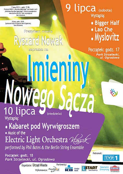 Myslovitz, Lao Che, Bigger Half, Kabaret pod Wyrwigroszem oraz Phil Bates wraz z The Berlin String Ensemble w projekcie Electric Light Orchestra Klassik to gwiazdy tegorocznych Imienin Miasta.