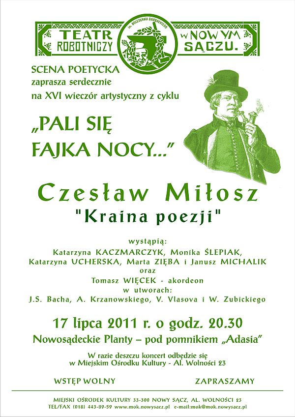 W najbliższą niedzielę 17 lipca 2011 r., o godzinie 20.30, na nowosądeckich Plantach pod pomnikiem Adama Mickiewicza, Scena Poetycka Teatru Robotniczego im. Bolesława Barbackiego zaprasza na XVI Wieczór Artystyczny z cyklu "Pali się fajka nocy".