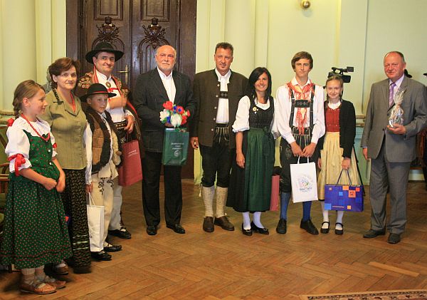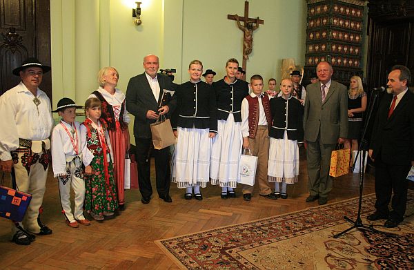 Następnie już w ratuszu Antoni Malczak - Dyrektor MCK Sokół zaprezentował przedstawicielom władz miasta i regionu uczestników ŚDzG. W kolejności, w jakiej będziemy je oglądać, kamrackie zespoły wymieniały się upominkami z lokalnymi decydentami.