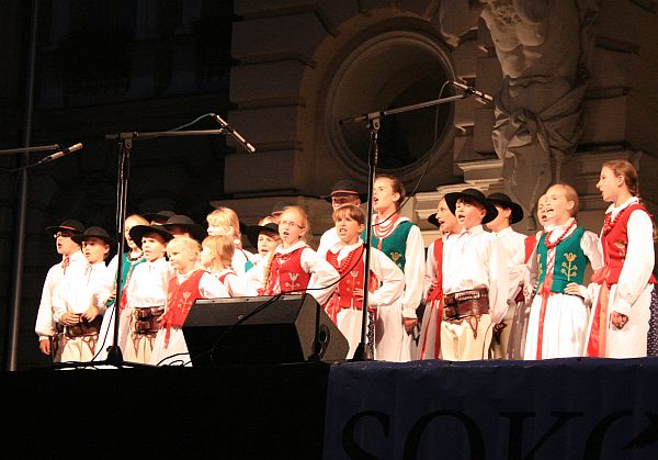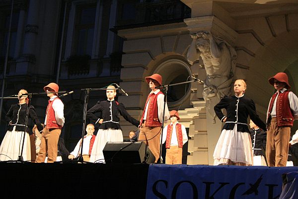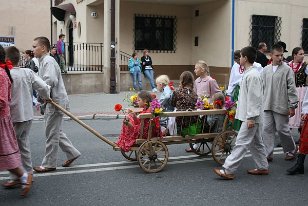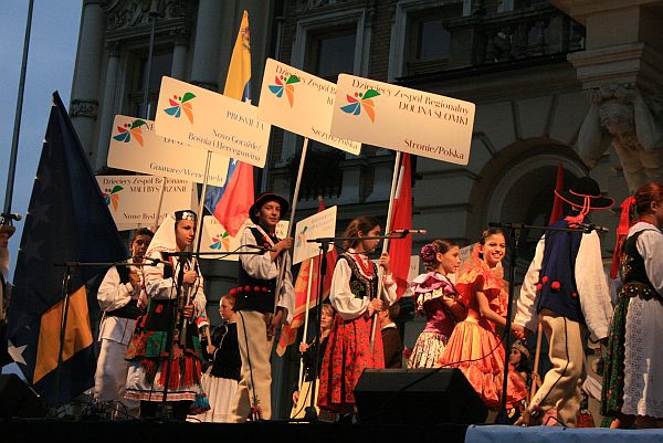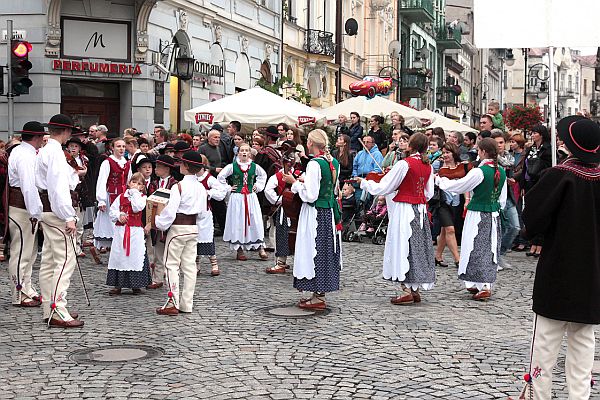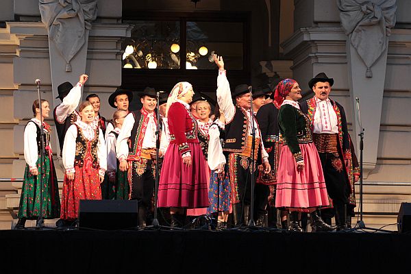 Kolejna godzina należała do uczestników Festiwalu. Tańcem, śpiewem, zabawą zapraszali nowosądeczan na kolejne narodowe dni. Dwanaście zespołów, sześć par, a wszystko płynnie, bo gdy występował jeden zespół, już kamracka kapela szykowała się po drugiej stronie. Krótka zapowiedź Józka Brody, poszukiwanie mamy zagubionej Kasi, i dalej, kolejny dzień, kolejna para kamracka. I znów zapowiedź. "Hej, Hej!" I jak echo "Hej, Hej!" Od publiczności. Taniec, śpiew, zabawa. Parę słów o zespole. Jeszcze brzmią słowa, jeszcze dźwięczy fujarka. ale już gra kolejna kapela, już następne dzieci wbiegają na scenę spod ratuszowego balkonu.