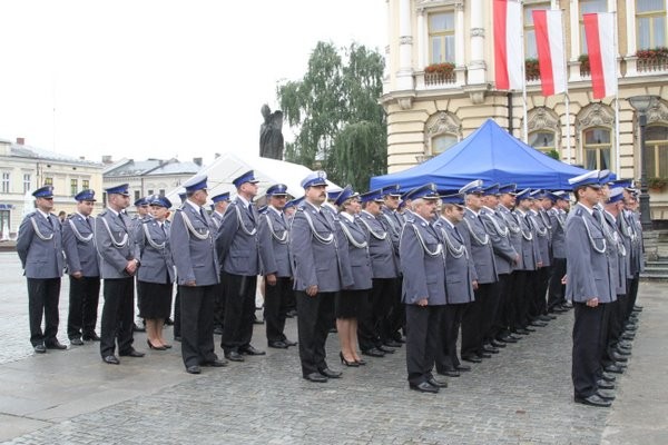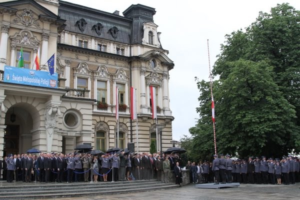 Podczas uroczystości głos zabrał również Komendant Główny Policji gen. insp. Andrzej Matejuk. „Chciałbym, w obecności tylu dostojnych gości pogratulować małopolskim funkcjonariuszom zatrzymania sprawcy wybuchów w Krakowie. Policjanci małopolscy i ci w całym kraju, swój profesjonalizm potwierdzają w codziennych obowiązkach. Cieszę się bardzo, że rośnie skuteczność małopolskich policjantów w zatrzymywaniu sprawców przestępstw pospolitych, tych najbardziej dokuczliwych dla mieszkańców. Rośnie aktywność funkcjonariuszy w zwalczaniu przestępczości narkotykowej, gospodarczej. Staramy się ograniczać przestępczość wśród nieletnich. Ważne jest to, że te sukcesy widzą mieszkańcy, bo to właśnie oni w ponad 60 procentach dobrze oceniają skuteczność policji. W ponad 64 procentach dobrze oceniają służbę policjanta, w swoim miejscu zamieszkania. Za to gorąco, wszystkim policjantkom i policjantom dziękuję. Małopolscy funkcjonariusze doskonale wiedzą, że bycie policjantem to nie tylko zawód, ale przede wszystkim misja służenia innym. Jestem przekonany, że rosnące wymagania wobec policji ze strony społeczeństwa będziemy się starać dobrze realizować” - podkreślił komendant.