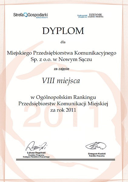 Miejskie Przedsiębiorstwo Komunikacyjne Sp. z o.o. w Nowym Sączu na VIII miejscu w Ogólnopolskim Rankingu Najlepszych Przedsiębiorstw Komunikacji Miejskiej za rok 2011.