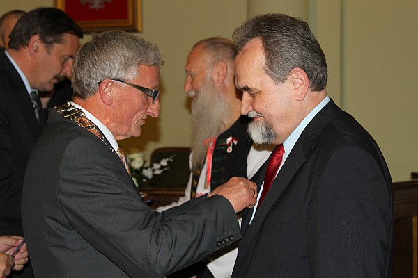 Następnie Przewodniczący Rady Miasta Jerzy Wituszyński wraz z wiceprzewodniczącymi wręczyli tarcze herbowe "Zasłużony dla Miasta Nowego Sącza" Józefowi Brodzie i Antoniemu Malczakowi. Honorowe odznaczenia Rada Miasta w maju przyznała również Helenie Łazarskiej oraz Waldemarowi Malickiemu. Wczoraj odebrali je tylko Antoni Malczak - dyrektor MCK "SOKÓŁ" oraz Józef Broda - dyrektor artystyczny Międzynarodowego Festiwalu Dziecięcych Zespołów Regionalnych "Święto Dzieci Gór”. Pozostała dwójka z przyczyn osobistych nie mogła być w Nowym Sączu. W uroczystej sesji uczestniczył również Honorowy Obywatel Nowego Sącza Krzysztof Pawłowski oraz zaproszeni goście.