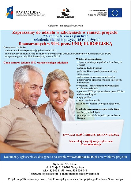 Systema Sp. z o.o. zaprasza na SZKOLENIA KOMPUTEROWE dofinansowane w 90% przez Unię Europejską. Szkolenia realizowane są w ramach projektu „Z komputerem za pan brat – szkolenia dla osób powyżej 45. roku życia”.