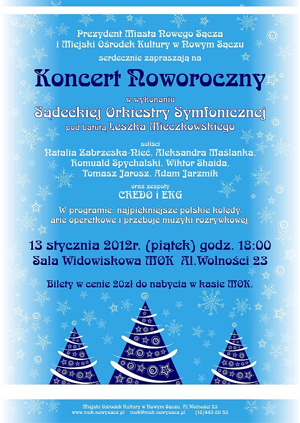 Sądecka Orkiestra Symfoniczna pod batutą Leszka Mieczkowskiego, soliści: Natalia Zabrzeska-Nieć, Aleksandra Maślanka, Romuald Spychalski, Wiktor Schaida, Tomasz Jarosz, Adam Jarzmik oraz zespoły Credo i EKG zaśpiewają podczas Koncertu Noworocznego, który odbywa się pod patronatem prezydenta Nowego Sącza. Koncert odbędzie się 13 stycznia (piątek) o godz. 18.00 w Miejskim Ośrodku Kultury. W programie najpiękniejsze polskie kolędy, arie operetkowe i przeboje muzyki rozrywkowej. Bilety do nabycia w kasie MOK.