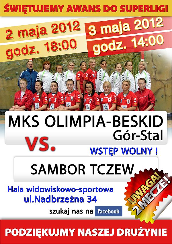 W pięknym stylu weszły do superligi. Zanim jednak wyjadą na zasłużony odpoczynek, zapraszają kibicówn na mecz o tytuł mistrza pierwszej ligi. Mowa o drużynie MKS Olimpii-Beskid/Gór-Stal. Pierwsze spotkanie rozegrane zostanie 2 maja o godzinie 18:00, natomiast rewanż 3 maja o godzinie 14:00. Będzie to doskonała okazja, aby podziękować zawodniczkom za cały sezon 2011/2012.